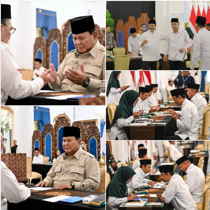 Presiden Prabowo beserta jajaran Kabinet Merah Putih menunaikan zakat melalui Baznas di Istana Negara, Jakarta, Jumat (13/3). Zakat ditunaikan secara langsung sebagai bentuk keteladanan sekaligus dukungan terhadap penguatan peran Baznas dalam menyalurkan zakat bagi masyarakat.