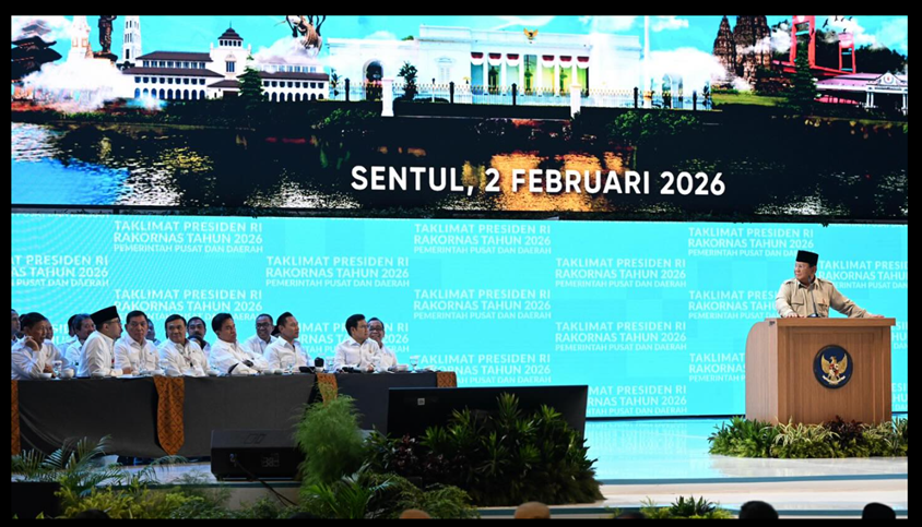Presiden Prabowo menyampaikan taklimat pada Rapat Koordinasi Nasional Pemerintah Pusat dan Daerah Tahun 2026 di Sentul International Convention Centre (SICC), Senin (02/02).